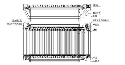 机器由输送链条、滚杠、机架、螺旋辊、导轮、传动减速机等部分组成。该机由提升机上料进入该机,通过两滚杠之间的间距不段变化来分级机的,分级时物料通过滚杠的输送向前运动,当物料运输到两滚杠之间的间距大于物料的外形尺寸时,物料就会自动掉入输出通道的皮带上被输出,从而达到分级目的。本设备是一台从小到樱桃、蓝梅,大到菠萝、柚子都可以分级的新型分级设备。而且在一定的分级范围内分级尺寸与分级级别可无级调整。